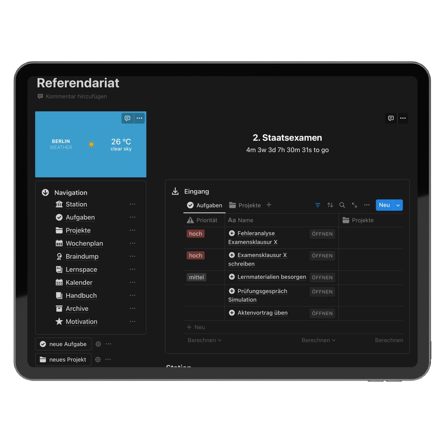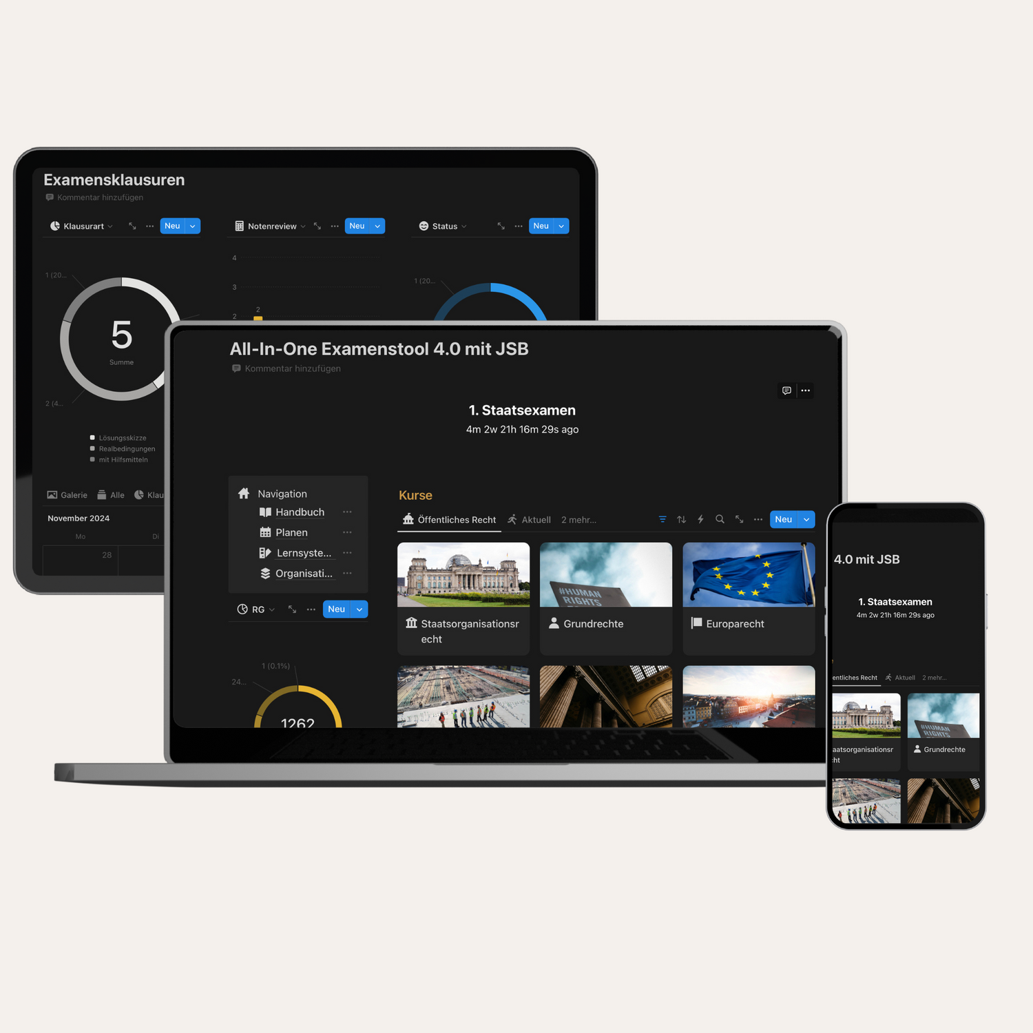 Das digitale Notion-Lernsystem fürs 1. Staatsexamen: vom Stoffplan über den Klausurenmanager bis zur Lernanalyse.